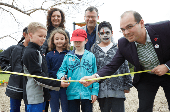 Waitematā Local Board Deputy Chair Pippa Coom, Chair Shale Chambers and Member Vernon Tava cutting the ribbon with local children.