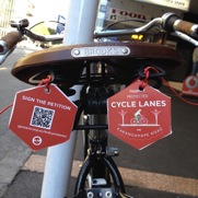 Saddle tags designed by the Generation Zero team for the #KRDCYCLELANES campaign as affixed to my bike