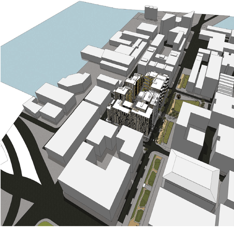 The overall scheme of six buildings in context, bounded by Beaumont, Pakenham West, Daldy and Gaunt Streets